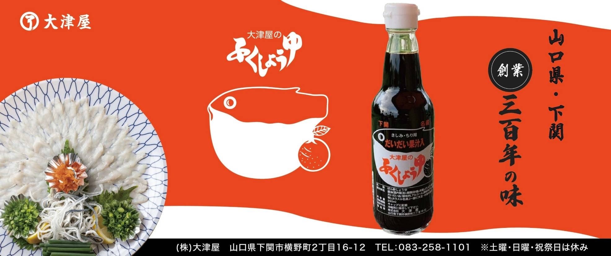 ふぐの本場下関 老舗が生んだ「ふくしょうゆ」 河豚料理にかかせない料亭の味 享保2年(1717年)創業 下関 大津屋の「ふくしょうゆ」 下関名産ふく料理のおいしさを、ご家庭でも簡単に味わっていただけるようにと誕生したぽん酢です。山口県萩市特産の「だいだい」をブレンド。醤油のコクと、さわやかなだいだいの香りを楽しんで頂けます。だいだい果汁でキレのある味わいを引き出すとともに、香り付けには、だいだいの皮から取れるだいだい油を使用。味、香り、コクにこだわりました。 ふく料理以外にも湯豆腐・焼餃子・かつおのたたきなどにも。 一年をとおして、築地市場をはじめとし、日本全国でご愛用して頂いています。 ■名称:ぽん酢しょうゆ ◾️原材料名 :醤油(国内製造)、糖類(砂糖・水飴)、だいだい果汁、だいだい油 / 酸味料、アルコール、調味料(アミノ酸等)、カラメル色素、(原材料の一部に大豆・小麦を含む) ◾️内容量 :360ml ◾️賞味期限 6ヶ月 ◾️保存方法:冷暗所に保存してください